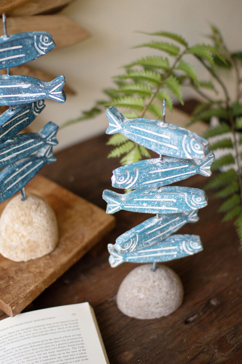 With this painted clay river rock sardine sculpture, the more the merrier. Honduras-made, this five-fish sculpture has a river rock base. Pair it with the vase or box for a themed set.