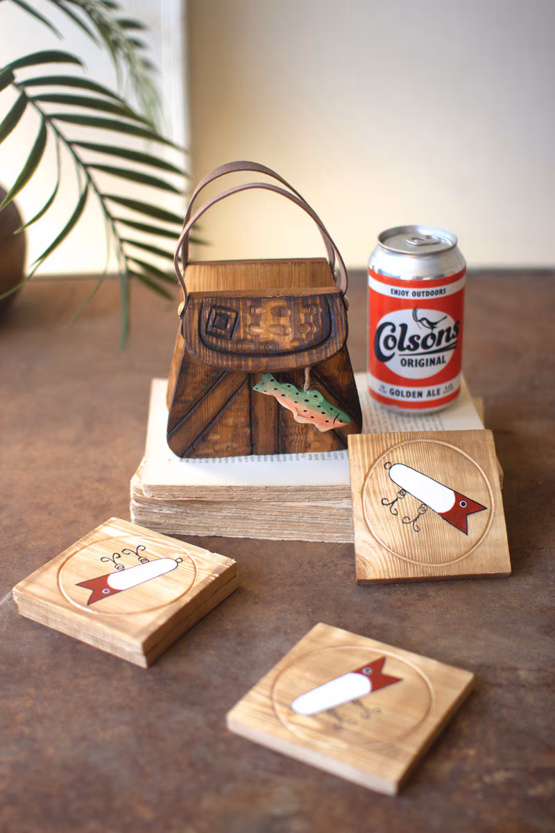 Set of 4 Wooden Fishing Lure Coasters with Tack Bag Holder